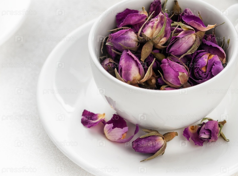 Белая чашка на белом блюдце, наполненная розовыми и фиолетовыми сушеными бутонами роз для заваривания чая. Крупный план. Выборочный фокус. Горизонтальный