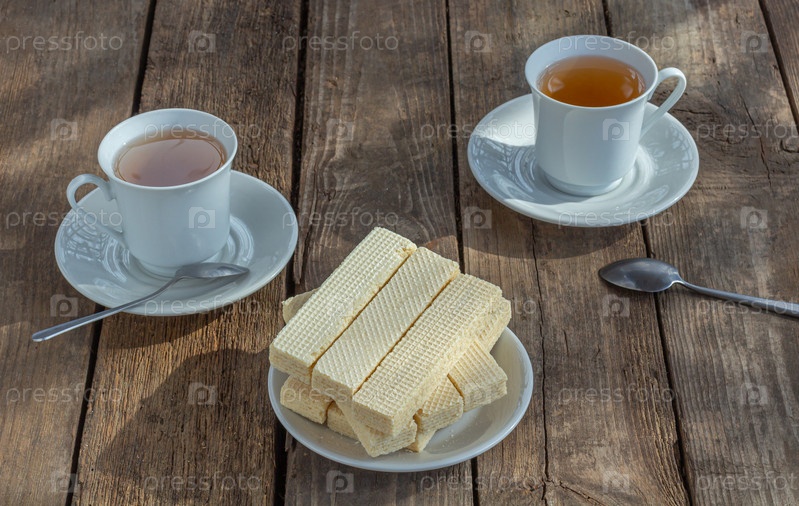 Чаепитие со сладкими русскими вафлями на деревянном фоне. Традиционные сладости и десерт