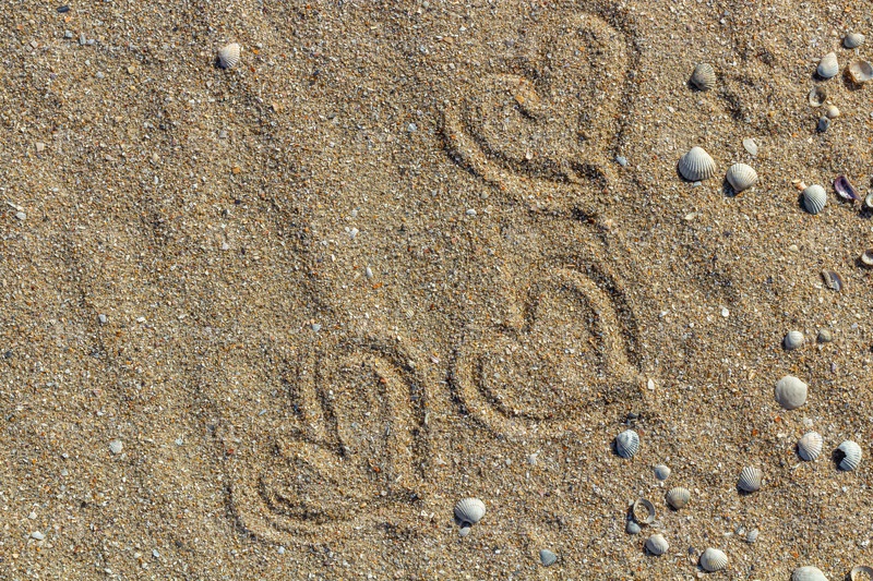 Сердце нарисовано на песке. Фон пляжа. Вид сверху, фон для дизайна