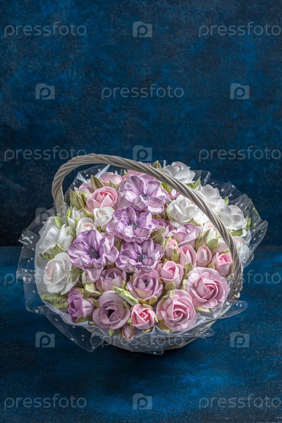 Зефирный букет цветов в корзине на голубом фоне
