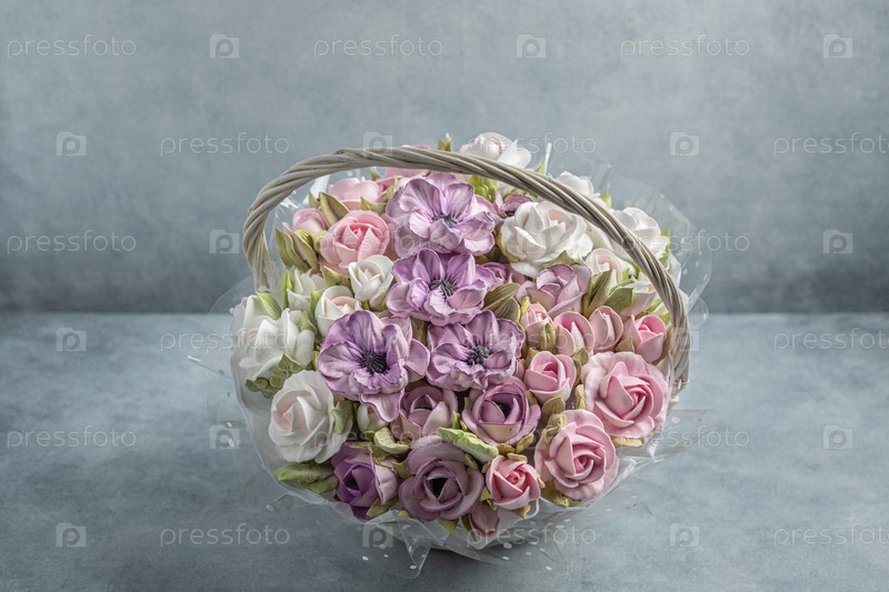 Зефирный букет цветов в корзине на светлом фоне, сладости для гурманов