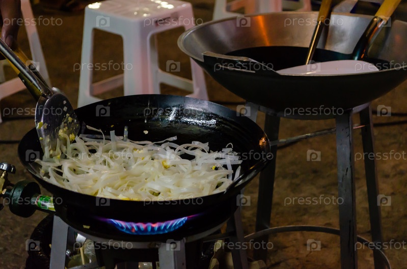 Приготовление традиционной лапши пад-тай на ужин на гриле в уличном киоске