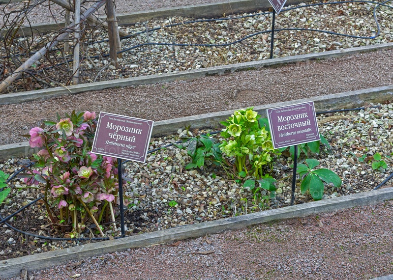 Цветущий морозник разных сортов на грядке в Аптекарском огороде, Москва. Начало апреля