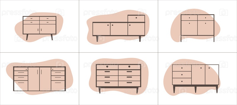 Шесть мебельных иконок. Тумбочки на фоне абстрактных фигур