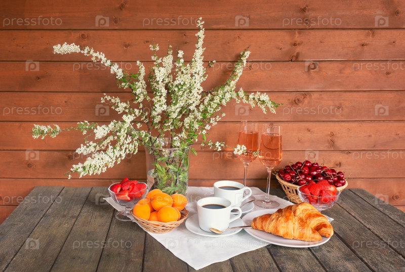 Букет цветов серой спиреи, чашки кофе, бокалы шампанского, фрукты и круассаны на состаренном деревянном столе