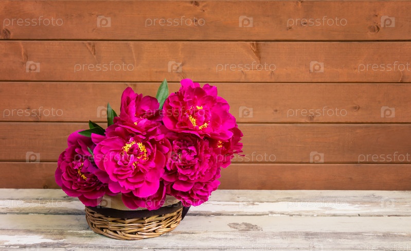 Красивые красные цветы пиона в плетеной корзине на старом деревянном столе