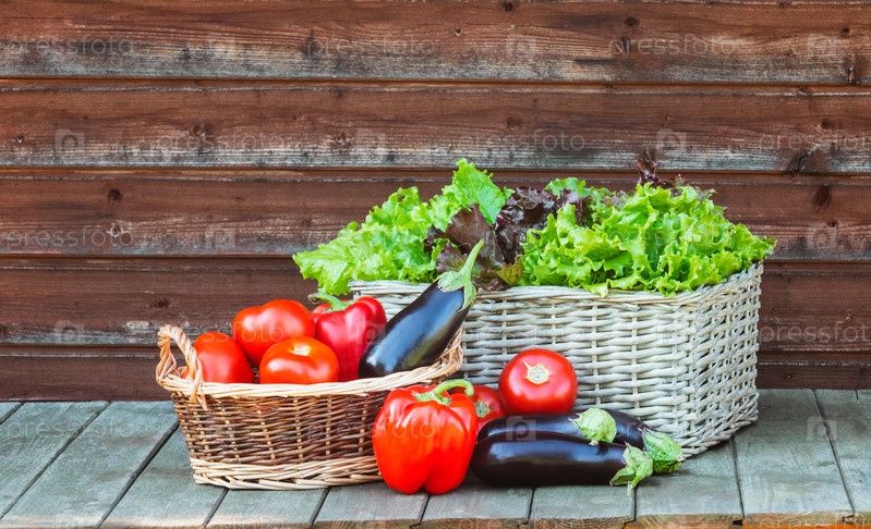 Свежие овощи и красочные листья салата на деревенском деревянном столе