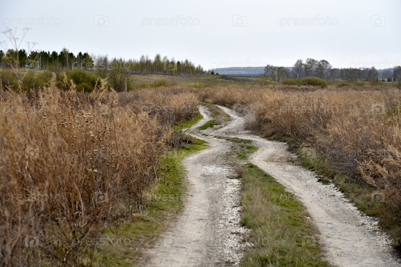 Сельская грунтовая дорога в поле и лесу. Сухая трава и сельская дорога