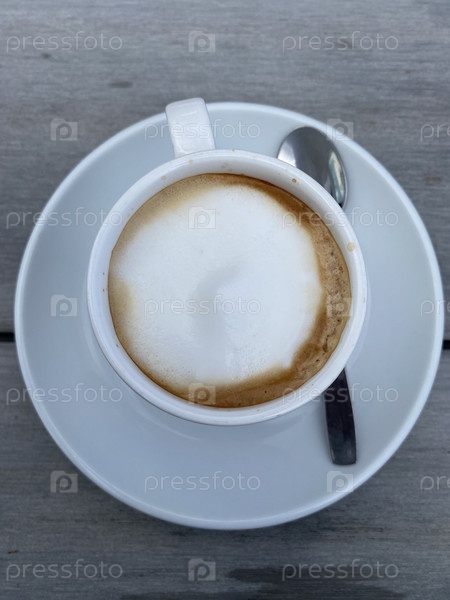 Белая чашка ароматного капучино, вид сверху, стоит на столе