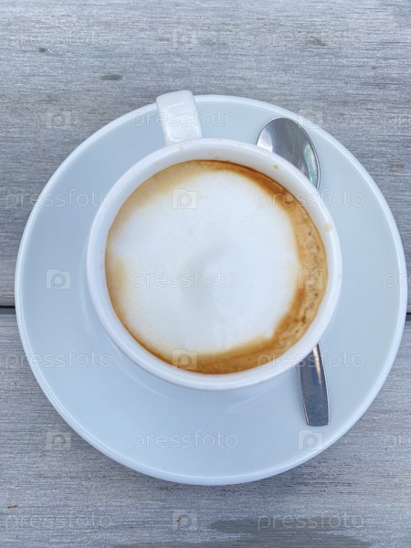 Белая чашка ароматного капучино, вид сверху, стоит на столе