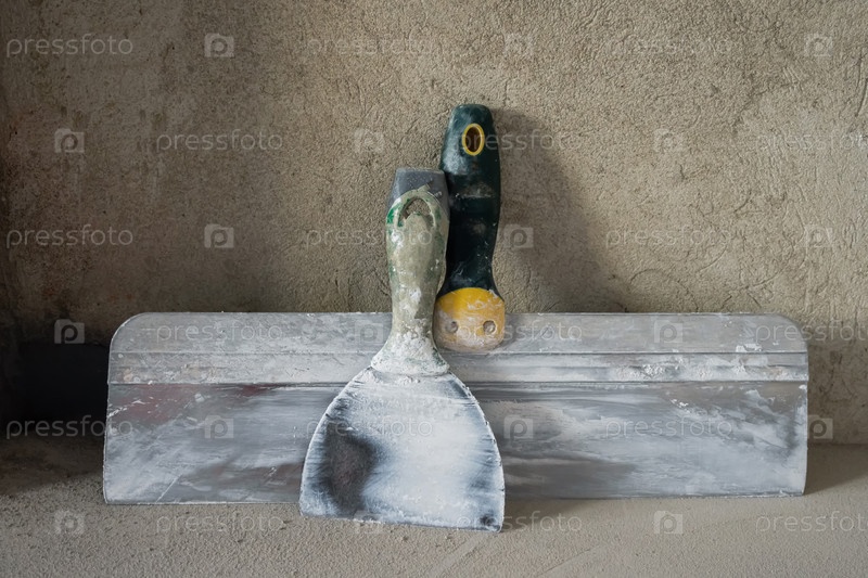 Две кельмы, широкие и средние, стоят на бетонном полу у оштукатуренной стены. Концепция ремонта комнаты