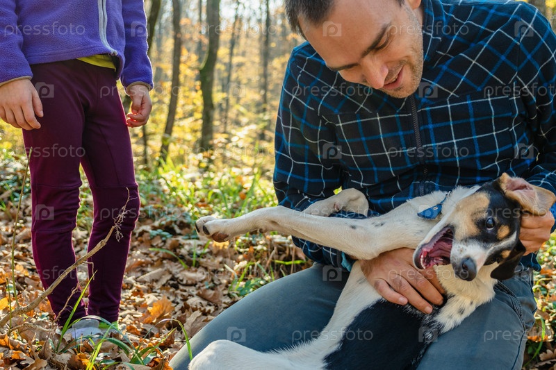 Мужчина в пледе играет с молодой собакой, лежащей у него на коленях. Крупный план. Рядом с ним стоит ребенок. Концепция любви и заботы о домашних животных