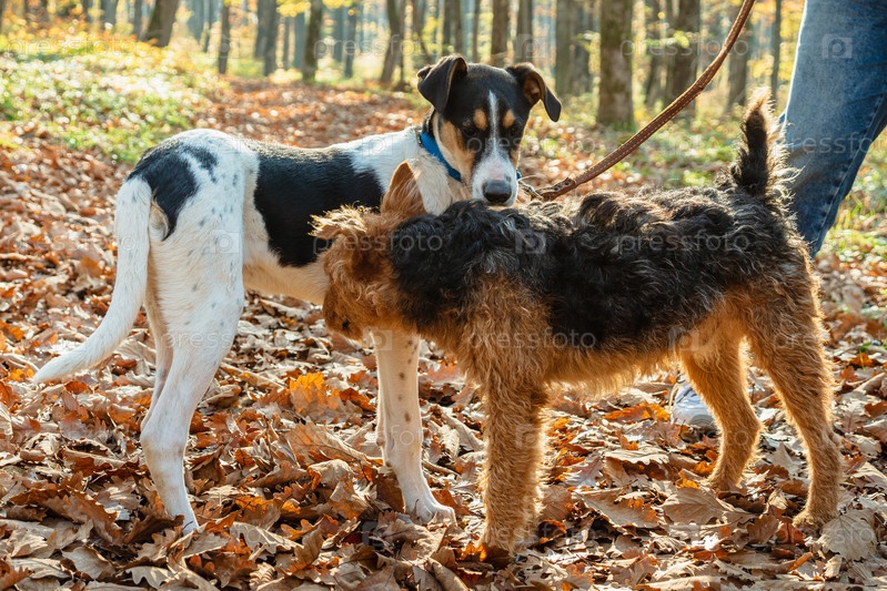 Две молодые собаки в осеннем лесу. Крупный план. Концепция выгула собак