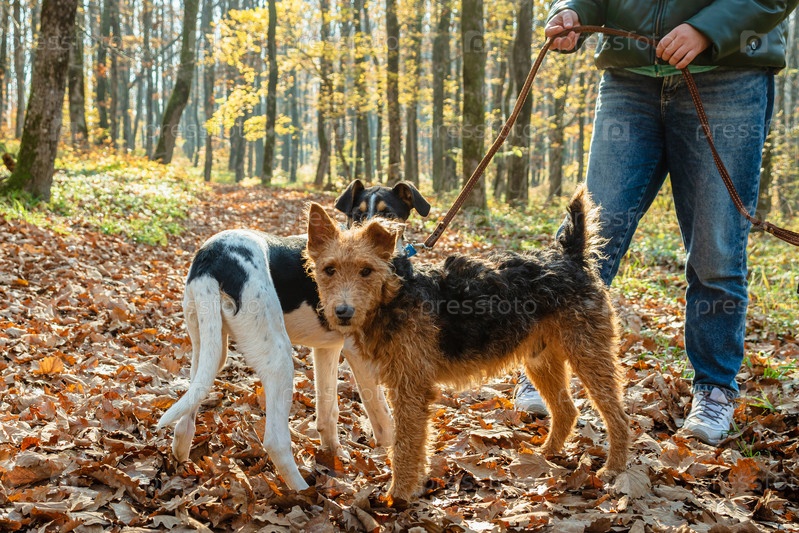 Две молодые собаки в осеннем лесу. Женщина в джинсах держит поводок. Концепция выгула собак