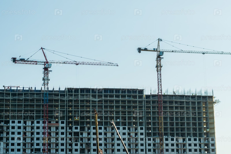 Строительство многоэтажного дома. В кадре высотные краны и люди. Монолитное здание обложено пеноблоками. Концепция доступного жилья