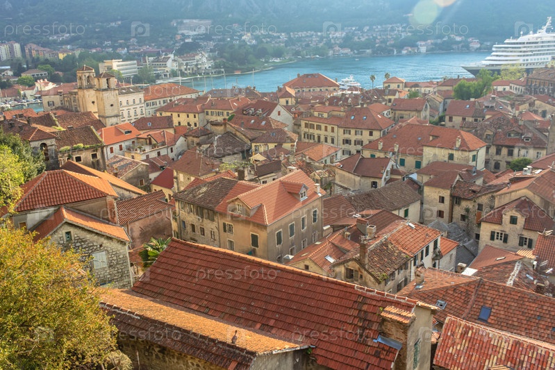 Каменные дома с красными черепичными крышами в старом городе Котор. На фоне бухи и круизного лайнера