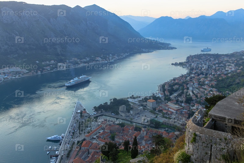 Боко-Которский залив с круизными лайнерами на закате. Концепция туризма в Черногории