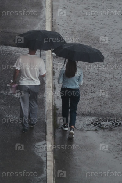 Мужчина и женщина идут рядом друг с другом под черными зонтиками. Отражение капель дождя на мокром асфальте. Серый, дождливый день. Вид сверху со спины