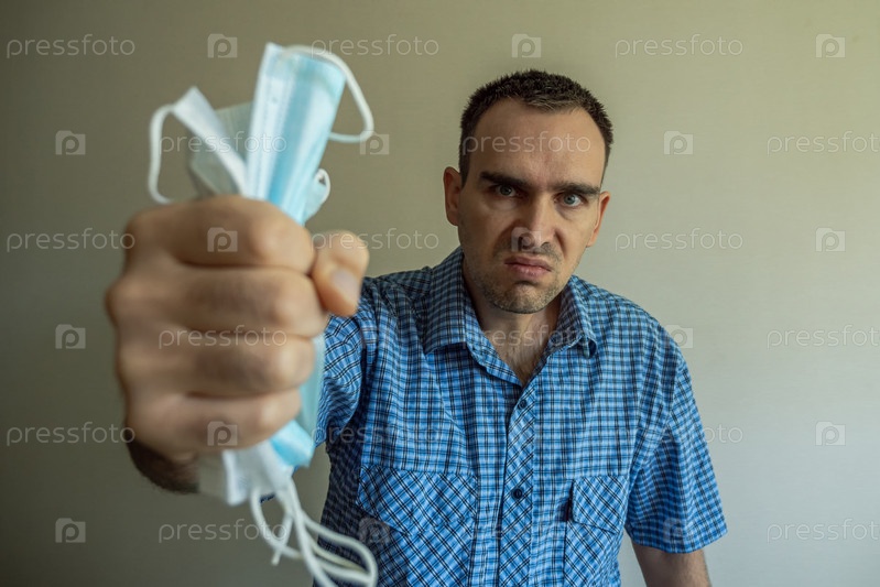 Кавказец в синей клетчатой рубашке сжимает в руке медицинские маски. Серый фон. Противодействие масочному режиму и вакцинации. Крупный план