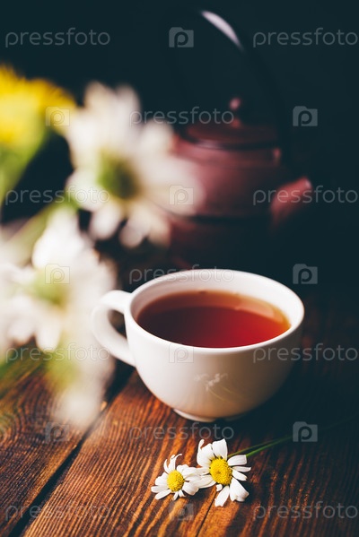 Чашка черного чая и два цветка ромашки на деревянной поверхности. Размытый букет на переднем плане