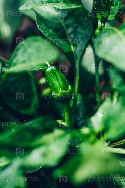 Маленький зеленый перец чили, растущий в саду на заднем дворе