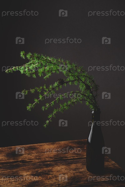 Натюрморт с веткой лиственницы в стеклянной бутылке