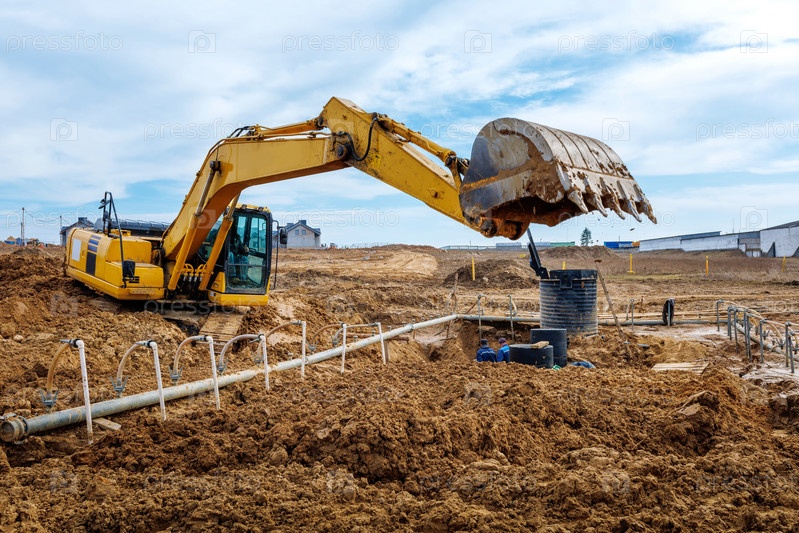 Экскаватор копает траншеи на строительной площадке. Траншея для укладки наружных канализационных труб. Канализационная система многоэтажного дома. Рытье котлованного фундамента