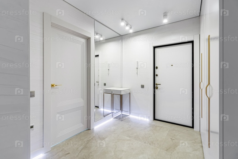 Современная прихожая в светлых тонах с межкомнатными дверями белого и золотого цвета
