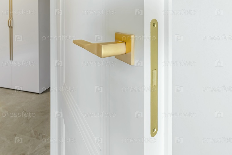 Белая дверь в классическом стиле. Открытая белая дверь в ванную. Классическая белая дверь с золотой ручкой. Крупный план