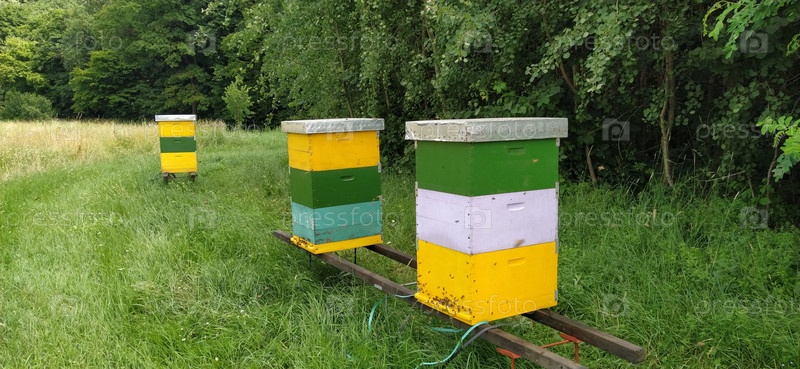 Ульи с пчелами. Пчеловодство. Ульи стоят в природе и окрашены в желтый, зеленый и синий цвета. Растения – медоносы. Пасека в Сербии. Пчелы собирают цветочный нектар и превращают его в мед