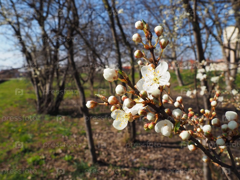 Цветущие фруктовые деревья в саду. Вишни, черешни, сливы, яблони в цвету. Белые цветы на ветвях