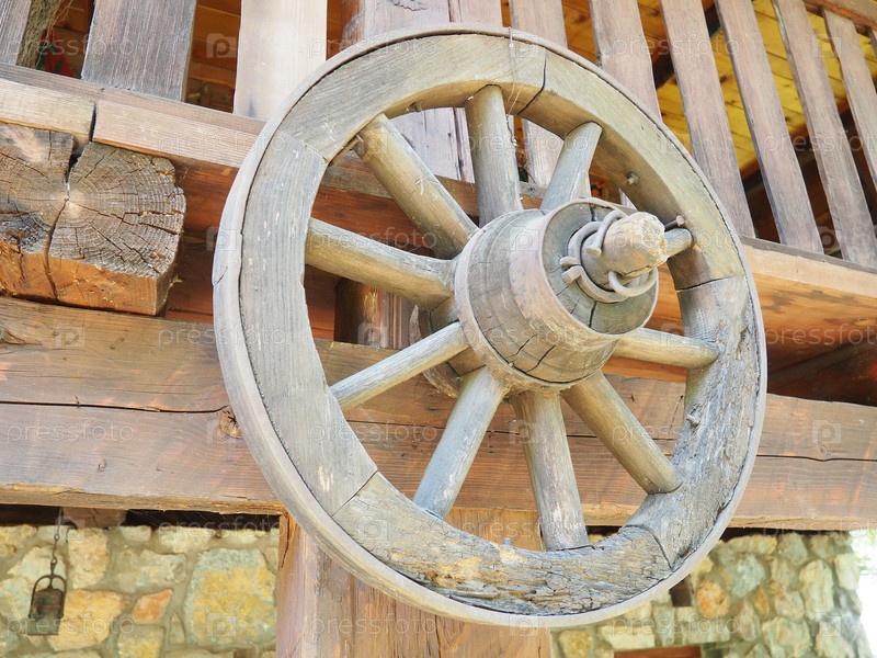 Деревянное колесо от телеги. Декоративные колеса для украшения газонов, экстерьеров и интерьеров в деревенском стиле. На стене висит круглое самодельное колесо. Ретро или винтажный стиль. Жизнь в деревне