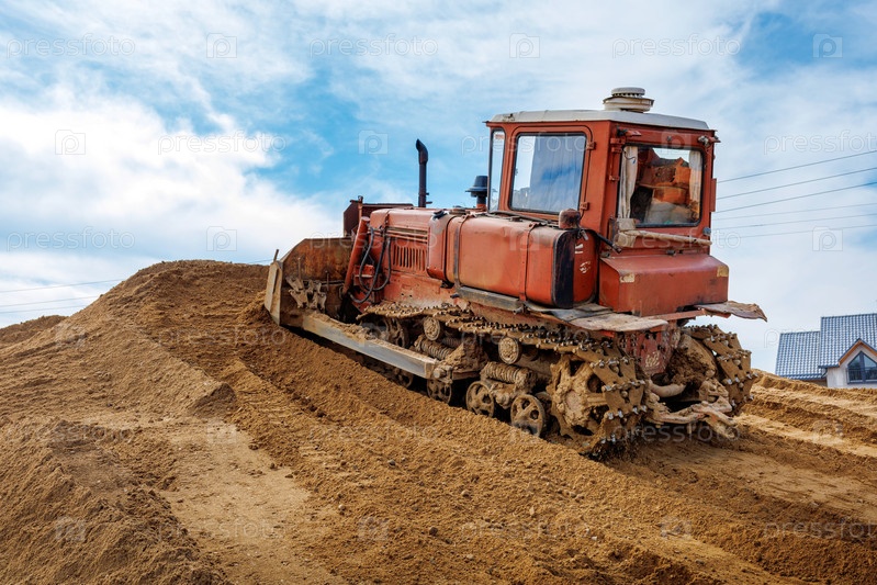 Старый оранжевый бульдозер выполняет работы по выравниванию песчаной почвы