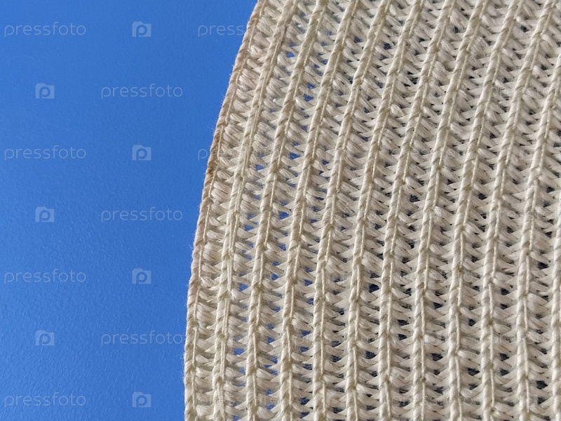 Соломенная шляпа на синем фоне. Край широких полей шляпы. Сплетите нити или веточки. Крупный план. Тема летнего отдыха