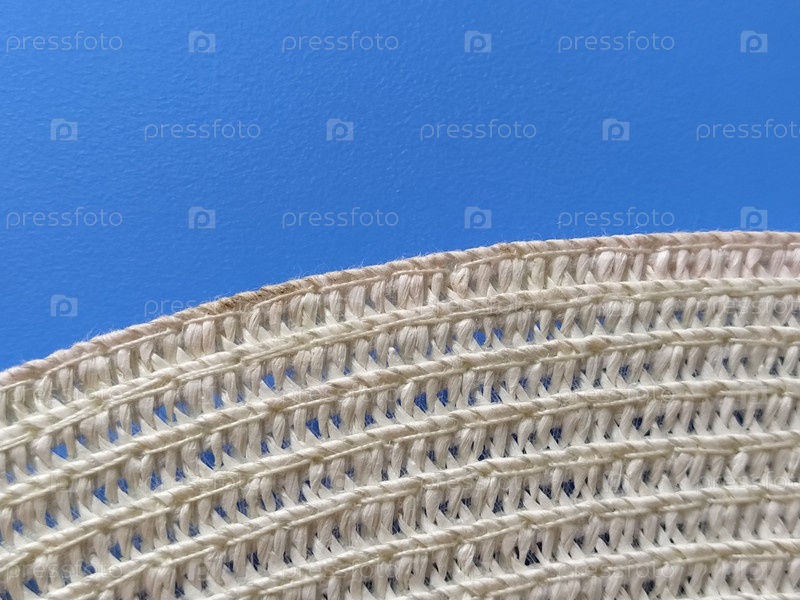 Соломенная шляпа на синем фоне. Край широких полей шляпы. Сплетите нити или веточки. Крупный план. Тема летнего отдыха