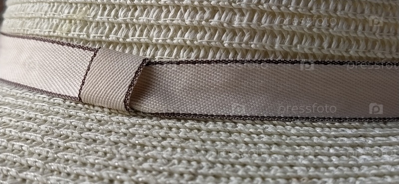 Лента для шляпы. Ремешок или украшение на головной убор. Крупный план соломенной шляпы. Тема путешествий и отдыха. Летний отдых