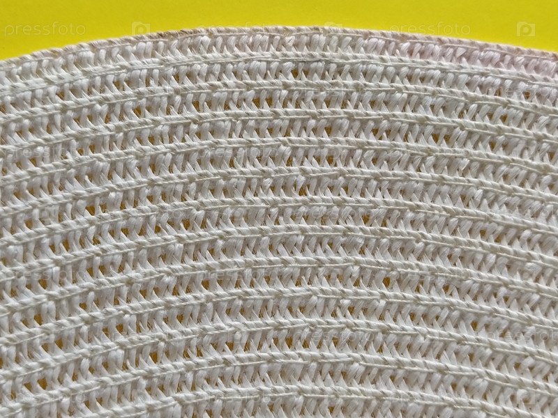 Соломенная шляпа на желтом фоне. Край широких полей шляпы. Сплетите нити или веточки. Крупный план. Тема летнего отдыха