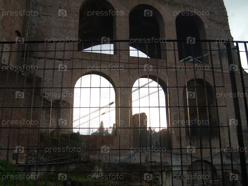 Реставрация римского Колизея. Металлический забор вокруг Колизея. Вечернее солнце пробивается сквозь высокие окна и проемы