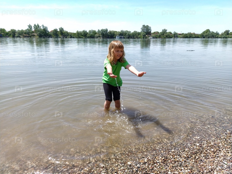 Девушка стоит по колено в воде и вытягивает руки вперед. Ребенок у пруда. Девушка с длинными белыми волосами улыбается и играет с каплями и брызгами. Сербия, река Сава, Сремска-Митровица