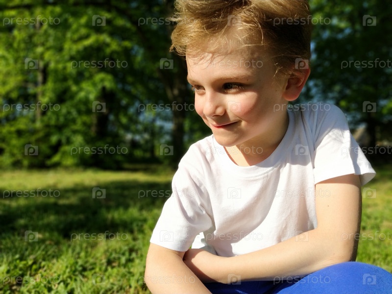 Милый мальчик улыбается и смотрит в сторону. Ребенок одет в белую футболку и синие брюки. Светлые волосы красиво падают на лоб. Длинные светлые ресницы. Парк на заднем плане