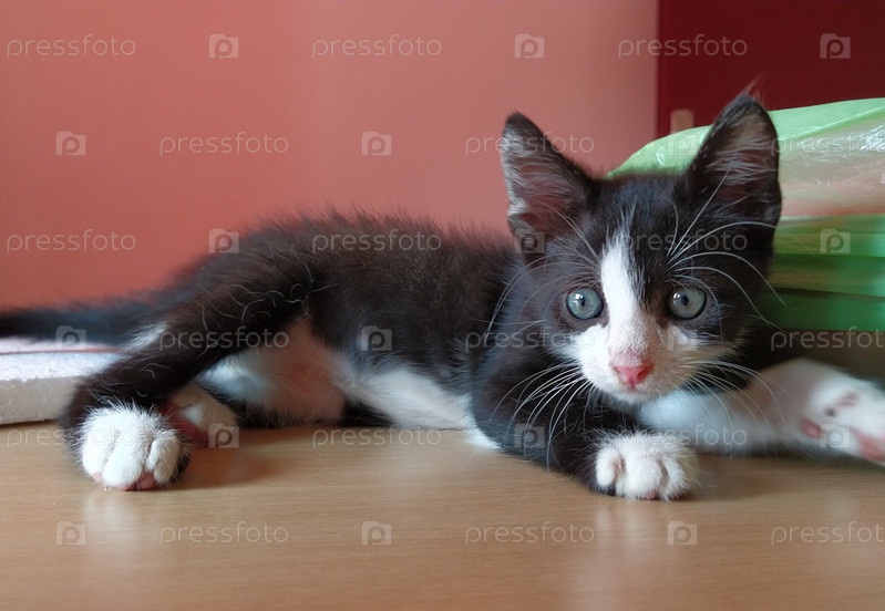 Черно-белый котенок с длинными белыми усами позирует перед камерой. Молодое забавное животное, живущее дома