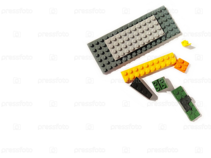 Детали детского конструктора на белом фоне. Творческая детская игра для развития воображения и пространственного мышления. Несколько игрушек