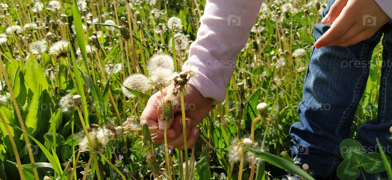 Девушка собирает цветы на лугу. Рука и нога в кадре. Одуванчики с белыми пушистыми семенами. Детская рука и пальцы. Зеленая трава на поле и луговые цветы. Солнечное освещение
