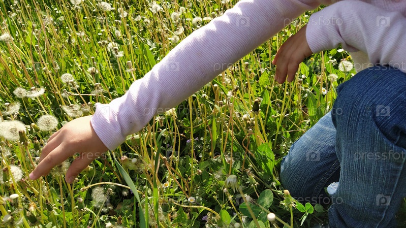 Рука и нога девушки касаются луговой травы. Одуванчики с белыми семенами. Понятие о сезонной аллергии. Концепция гармонии с природой. Длинный рукав. Ноги в синих джинсах
