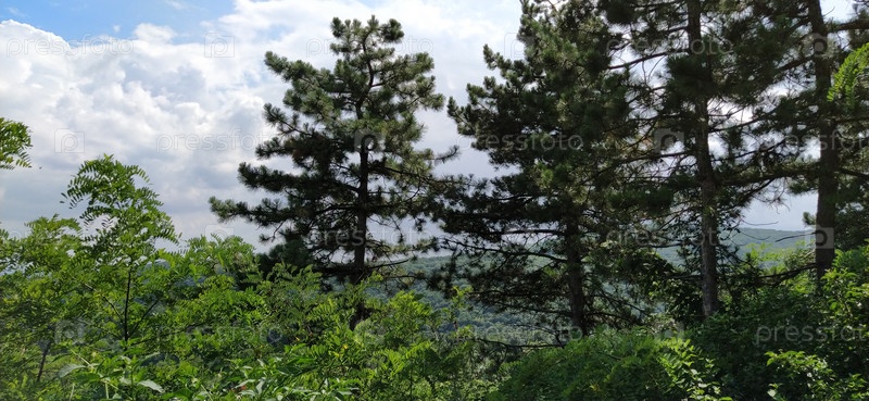 Сосновый лес и облачно-голубое небо в горах Фрушка-Гора в Сербии