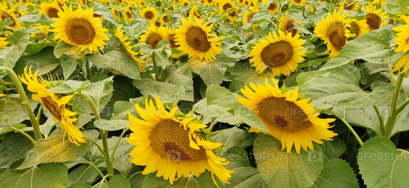Поле цветущих подсолнухов. Красивые желтые крупные цветки с темной серединкой. Семена подсолнечника. Сельскохозяйственная концепция. Крупные зеленые листья с опавшей на них желтой пыльцой. Крупным планом