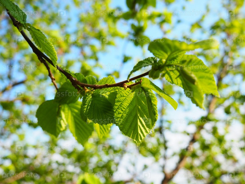 Ветка лещины. Весенний рост новых почек и листьев. Орешник. Молодая зелень в саду