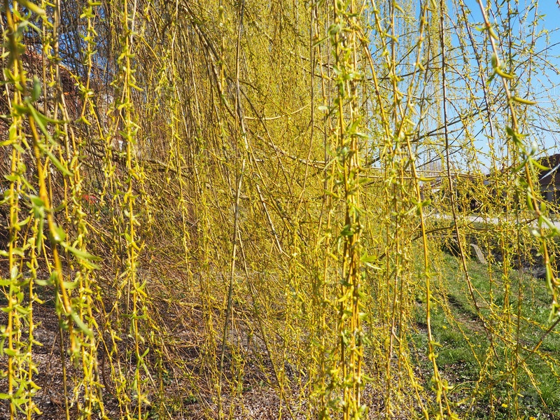 Плакучая ива в общественном парке. Каскадные длинные ветки ивы с желто-зелеными цветами. Цветущая ива весной. Голубое небо и солнечная погода