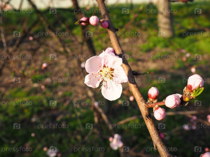 Дерево, цветущее белыми и розовыми цветами. Вишня, яблоня, слива или черешня в цветущем состоянии. Нежные белые лепестки. Сад. Поздравления с днем весны, с днем матери