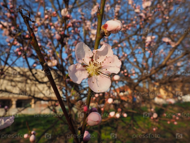 Дерево, цветущее белыми и розовыми цветами. Вишня, яблоня, слива или черешня в цветущем состоянии. Нежные белые лепестки. Сад. Поздравления с днем весны, с днем матери